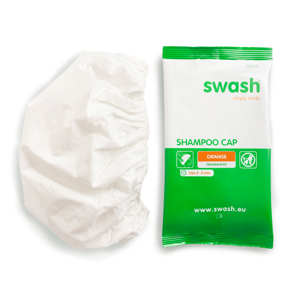 The Swash® Shampoo Cap is a single-use bathing cap, impregnated with a special hair care lotion. With a diameter of 30 cm, this cap is designed for easy and convenient hair washing without rinsing. The plasticized outside ensures the lotion stays inside the cap while protecting the caregiver's hands.